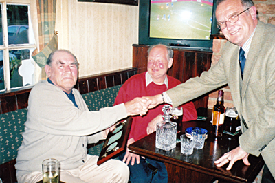 Billy Bell, retiring chairman of Sowerby Angling is presented with a cut glass decanter and malt whisky by Derek Stratton.